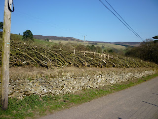 And kept walking. The plantations gave way to green pastures bounded by wire fences and by traditional drystone walls built of Millstone Grit. I was pleasantly surprised to see the hedge above this one had been properly laid over the winter.